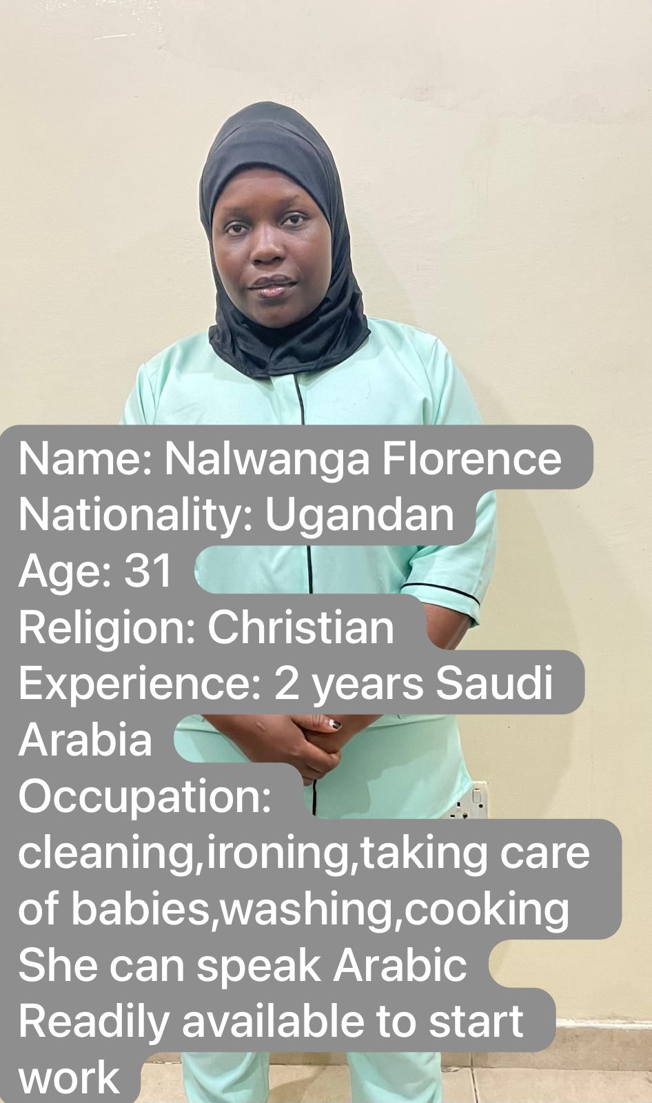 نالوانجا فلورنس أنثى أوغندية تبلغ من العمر 31 عامًا، مسيحية، لديها خبرة لمدة عامين كخادمة منزل في المملكة العربية السعودية، يمكنها التحدث باللغة العربية، ويمكنها طهي بعض الأطعمة العربية، ويمكنها التنظيف والغسيل والكي ورعاية الأطفال.