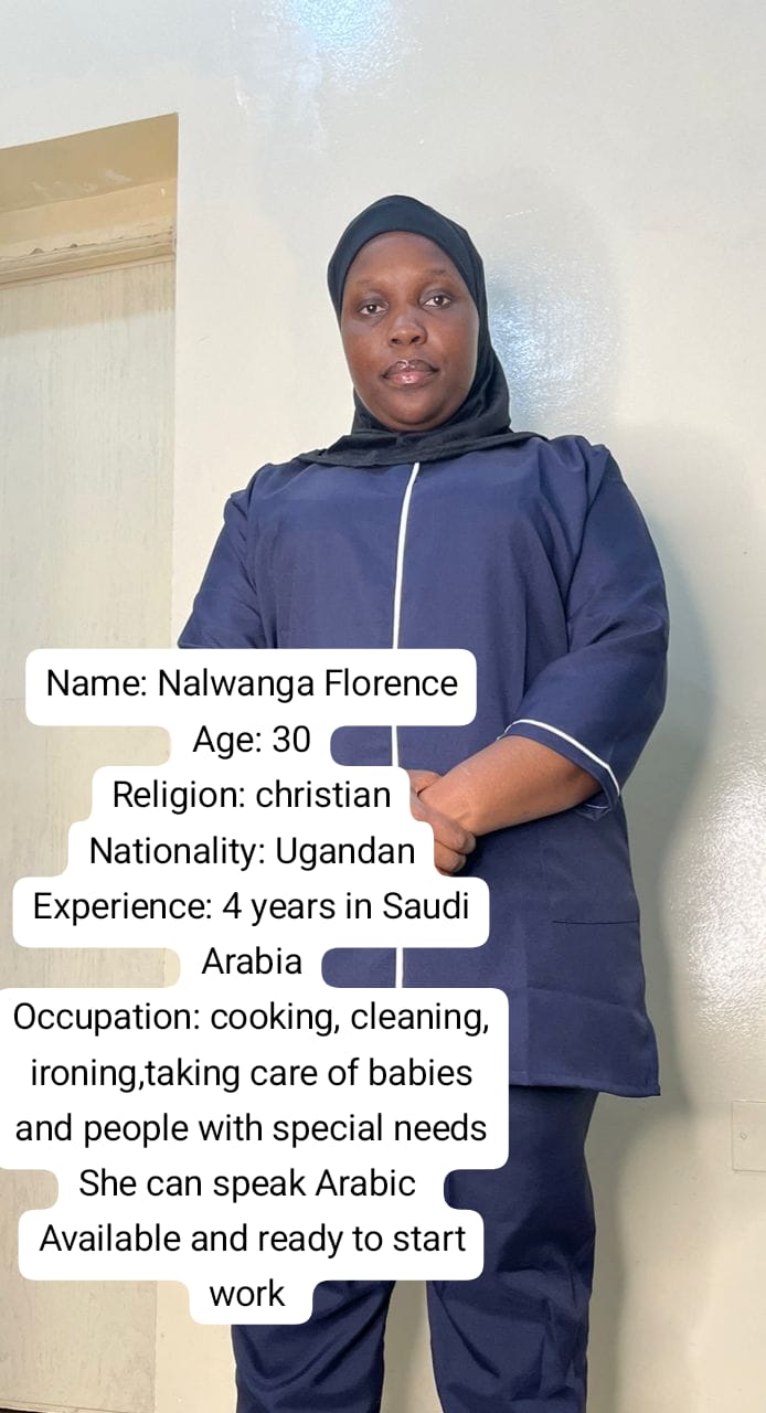 | نالوانجا فلورنس أنثى أوغندية عمرها 31 سنة، مسيحية، لديها خبرة سنتين كخادمة منزل في المملكة العربية السعودية، تجيد التحدث باللغة العربية، طبخ بعض الأطعمة العربية، التنظيف، الغسيل، الكي، رعاية الأطفال والمسنين وذوي الاحتياجات الخاصة، حاصلة على شهادة في رعاية كبار السن وذوي الاحتياجات الخاصة. الراتب 2000 ريال قطري ورسوم الشركة 500 ريال قطري. مكتب الاتصال (اوربان روك للتجارة والخدمات) على الرقم 71610363 | |