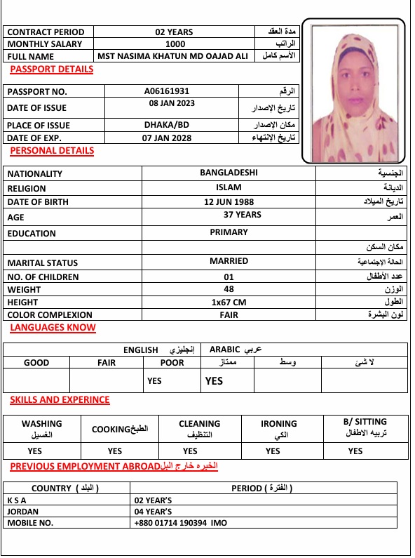 الاسم - عربي السيدة نسيمة خاتون إم دي أوجاد علي