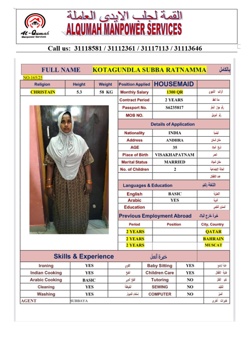 الاسم - عربي SUBBA RATNAMMA KOTAGUNDLA