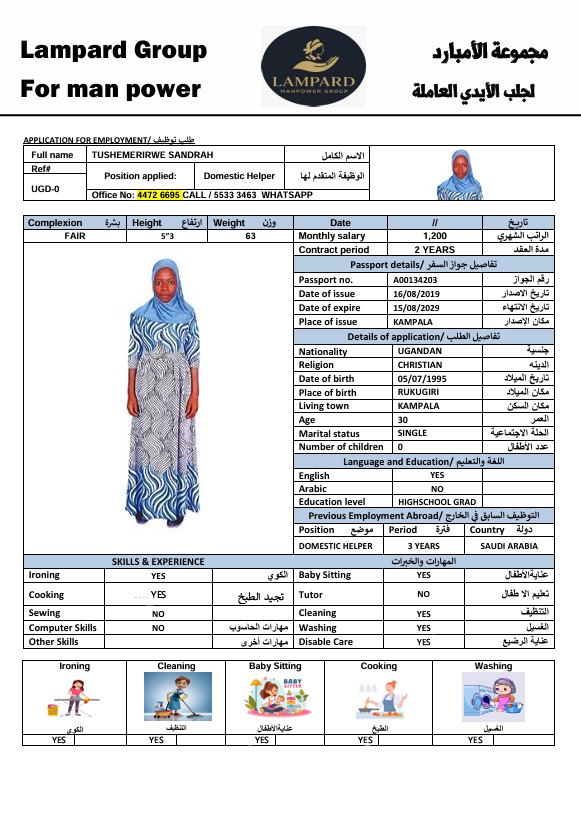 | 1. بدون أي مقدم عند طلب الاستقدام 2. رسوم الفحص الطبي والبصمة على حساب المكتب 3. التكلفة النهائية 5,000 ريال قطري بعد اجتياز الفحص الطبي والبصمة | |