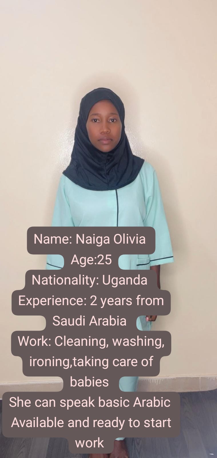 أوليفيا، شابة من أوغندا تبلغ من العمر 25 عامًا، لديها خبرة سنتين في المملكة العربية السعودية. تجيد التنظيف والغسيل والكي ورعاية الأطفال. تتحدث العربية بمستوى أساسي. متاحة للعمل بعقد شهري، براتب 1800 وعمولة مكتب 500. جاهزة لبدء العمل فورًا. للتواصل والاستفسار، يرجى الاتصال بشركة أوربان روك على الرقم 71610363. شكرًا لكم.