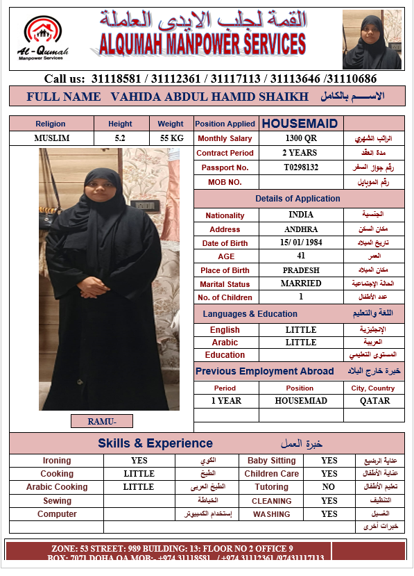 الاسم - عربي VAHIDA ABDUL HAMID SHAIKH