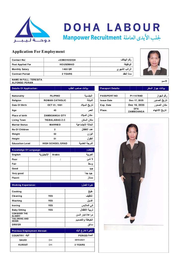 الاسم - عربي TERESITA ALFONSO PORAN