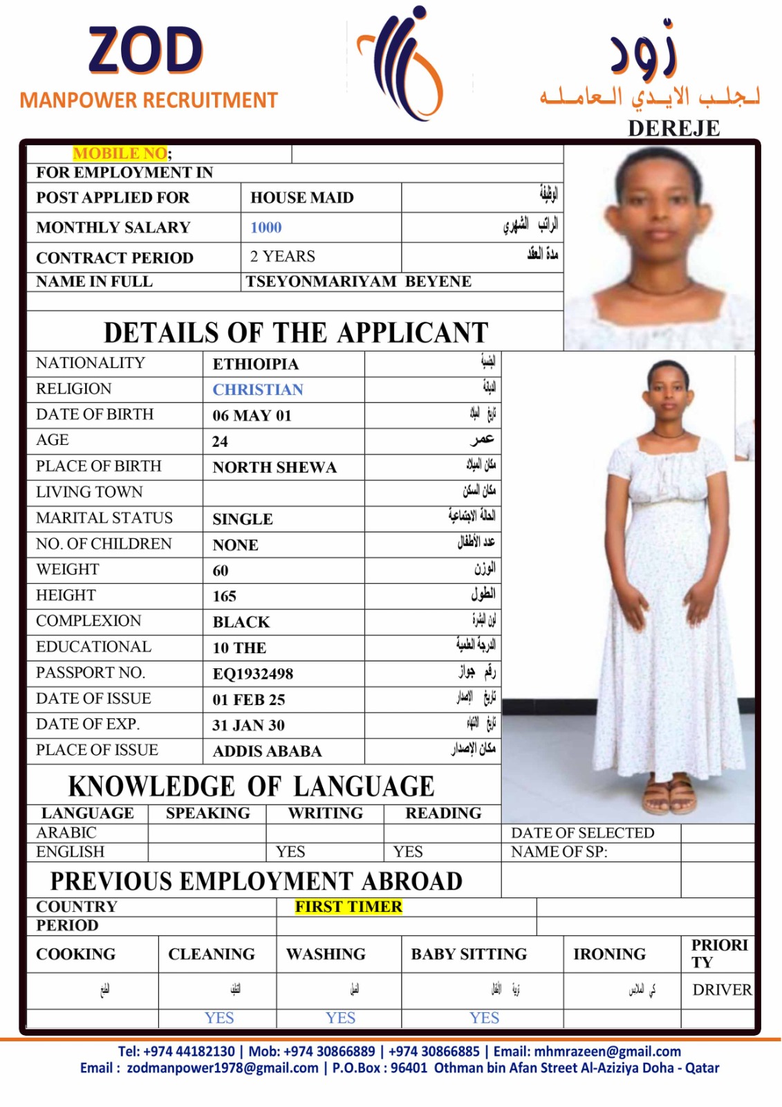 الاسم - عربي TSEYONMARIYAM BEYENE