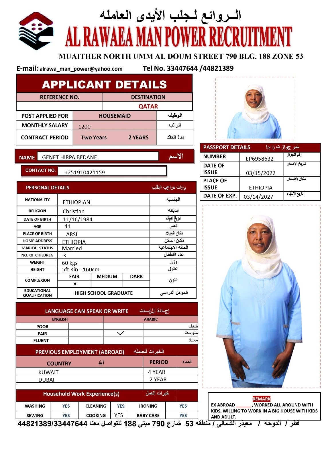 العنوان الدوحه / معيذر الشمالى / شارع ام الدوم منطقه 53 شارع 790 مبنى 188