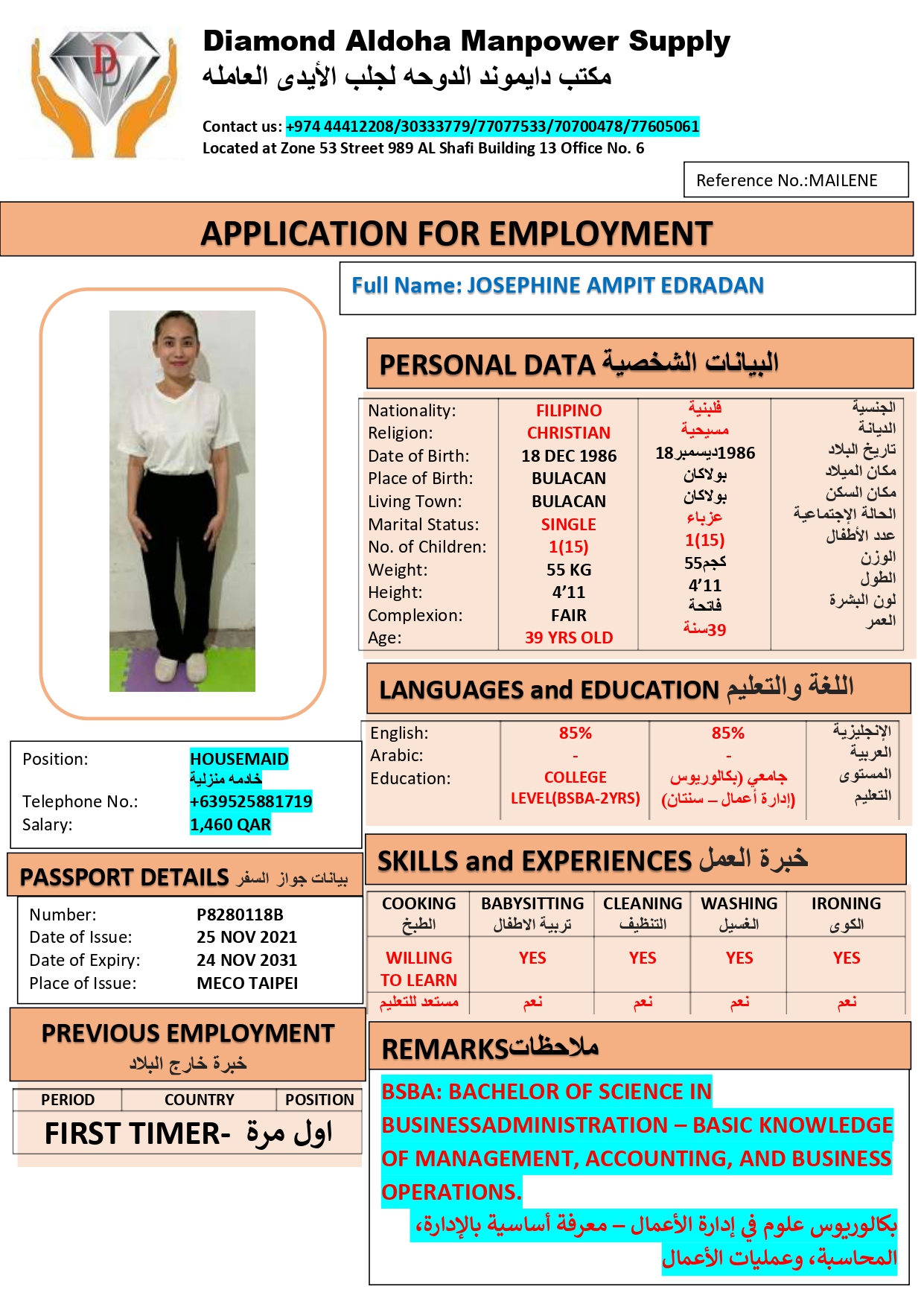 الاسم - عربي JOSEPHINE AMPIT EDRADAN