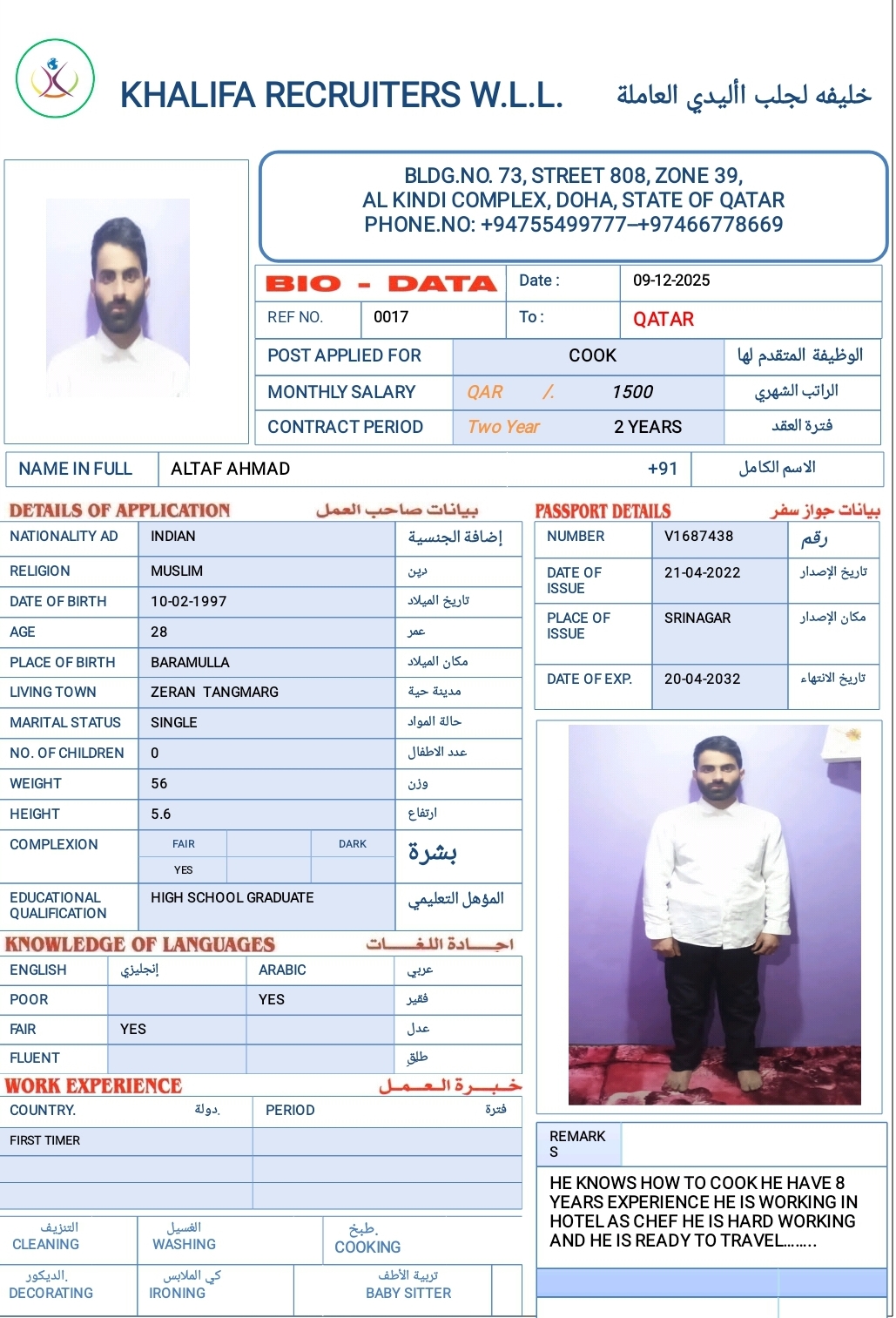 هو يجيد الطبخ، ولديه خبرة ثماني سنوات، وهو مجتهد ومستعد للسفر.