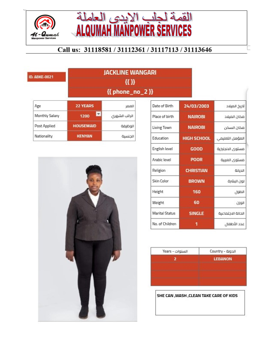 الاسم - عربي JACKLINE WANGARI