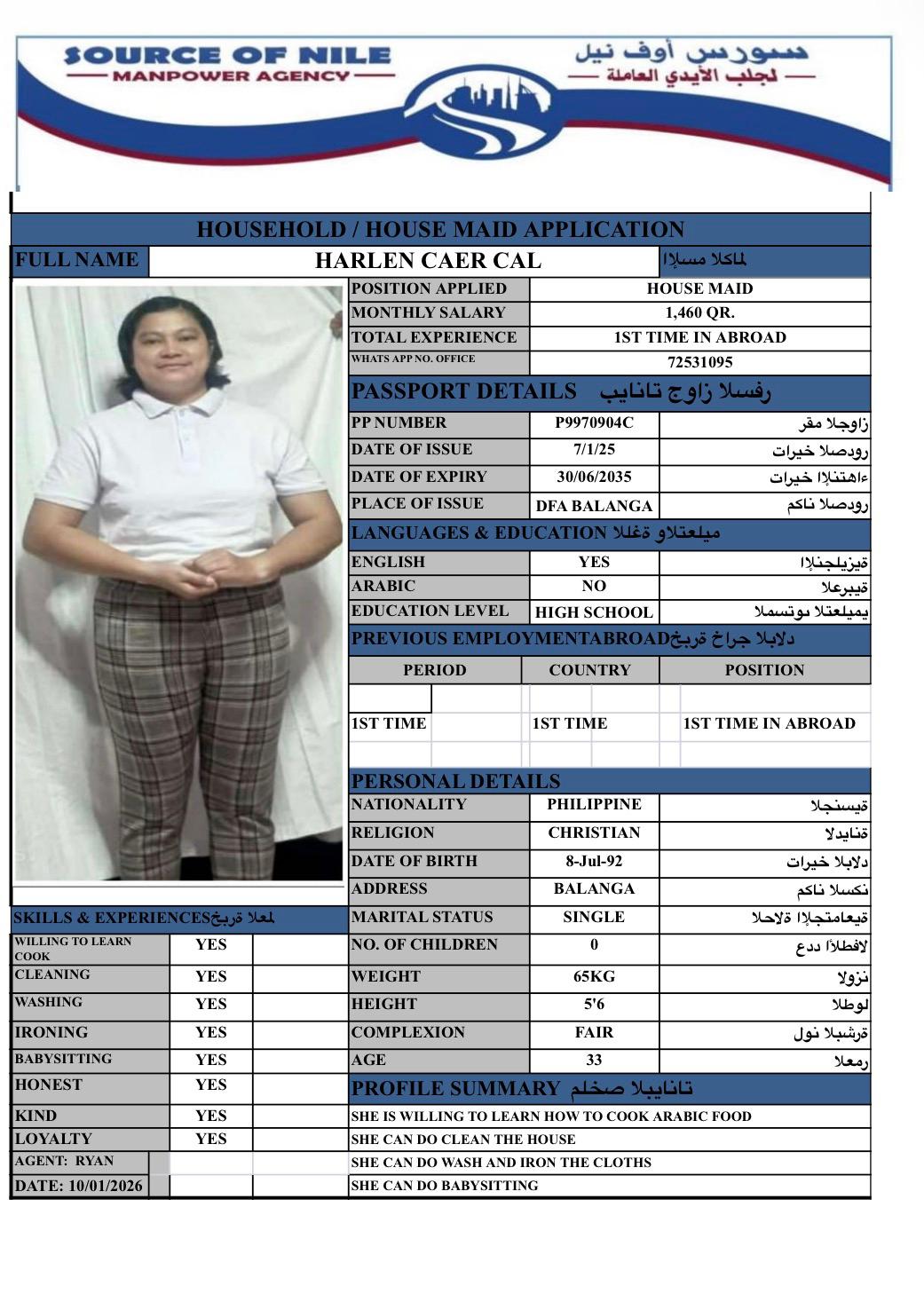 | SHE IS WILLING TO LEARN HOW TO COOK ARABIC COOK SHE CAN DO CLEAN THE HOUSE SHE CAN DO WASH AND IRONING CLOTHES SHE CAN DO BABY SITTING | |