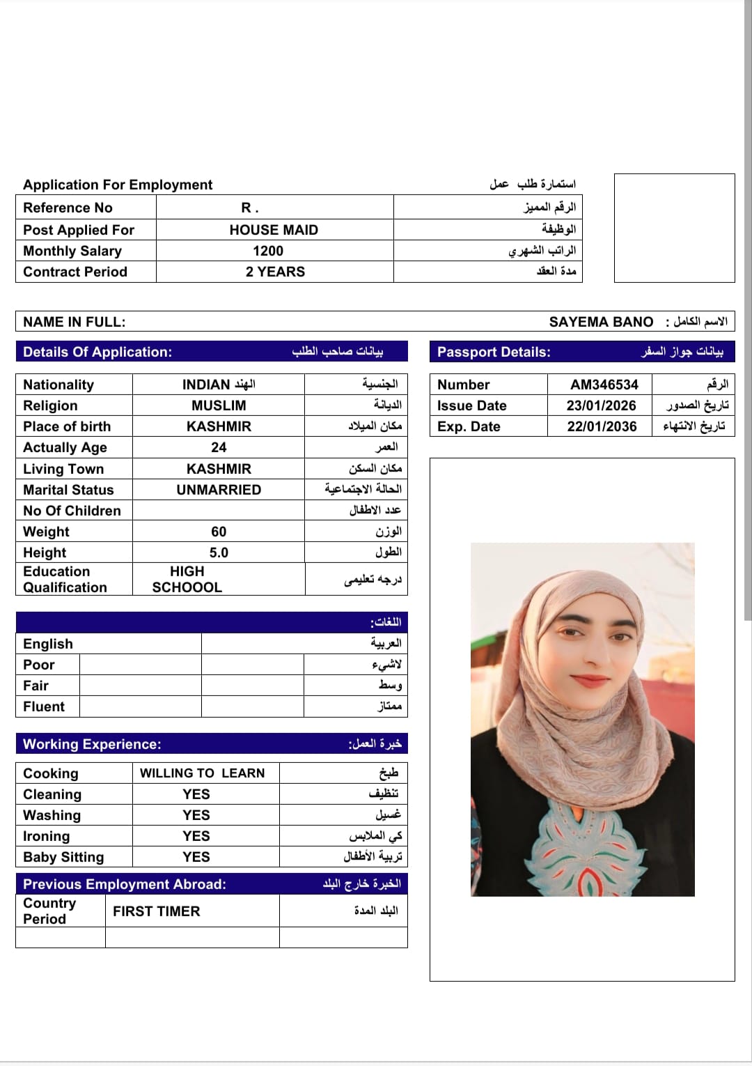 الاسم - عربي SAYEEMA BANO