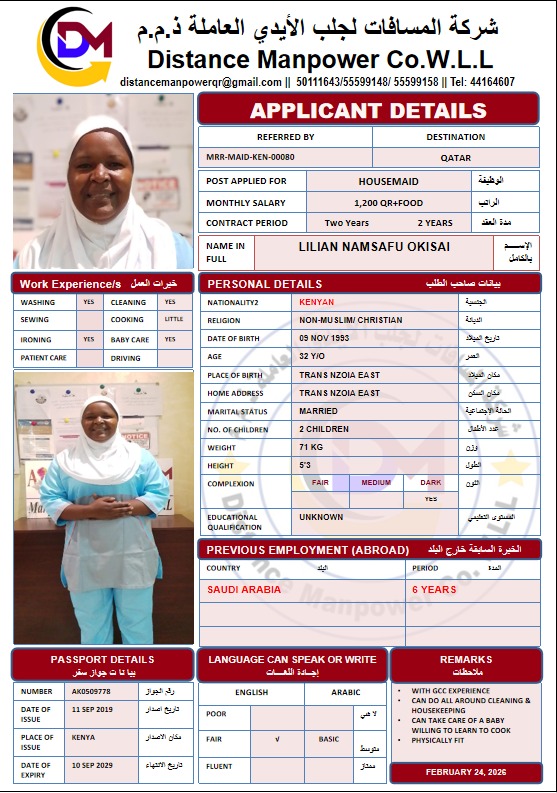 الاسم - عربي ليليان نامسافو أوكايساي ( غير متاحه مؤقتا. تم اختيارها من قبل عميل آخر وفي وانتظار تأكيد الحجز)