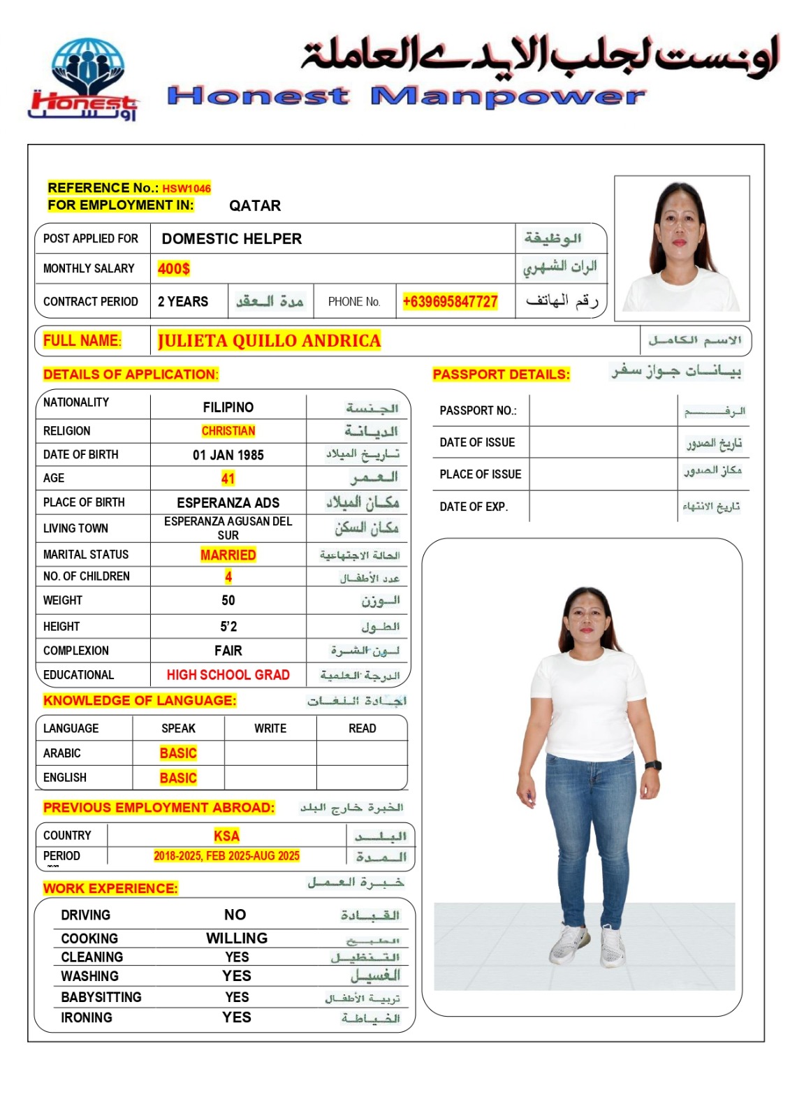 الاسم - عربي JULIETA QUILLO ANDRICA