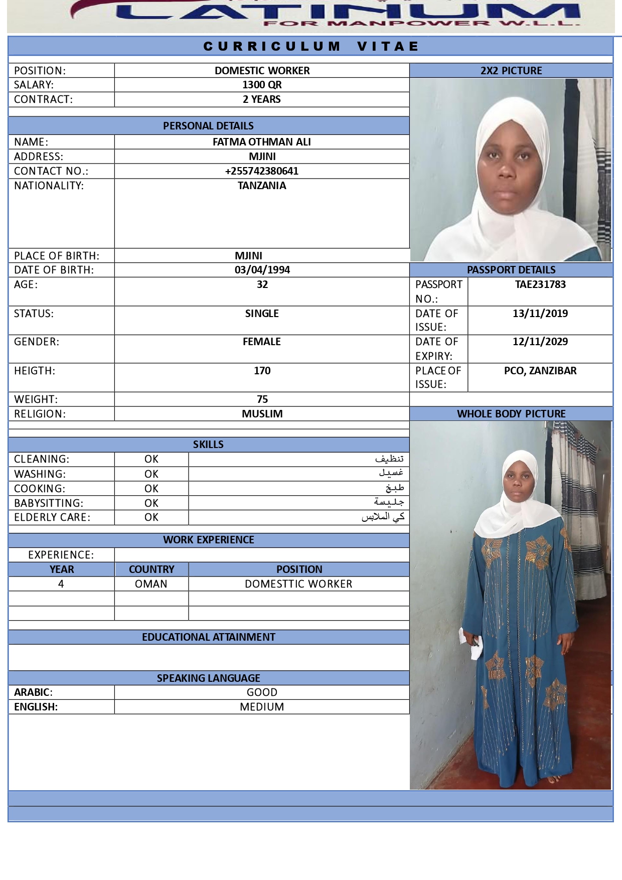 نعلن عن توفر عاملة منزل تنزانية ذات خبرة عالية في: