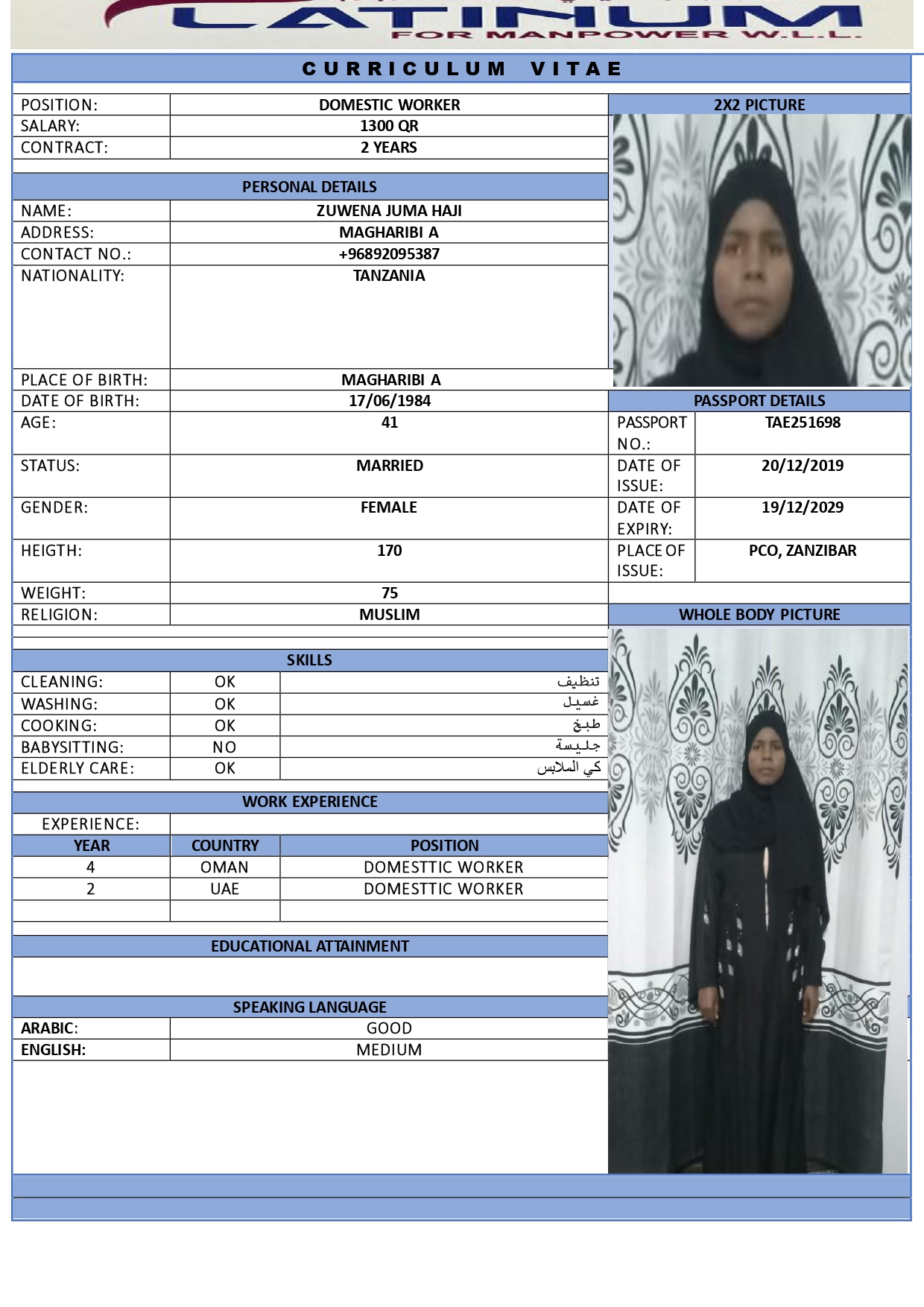 نعلن عن توفر عاملة منزل تنزانية ذات خبرة عالية في: