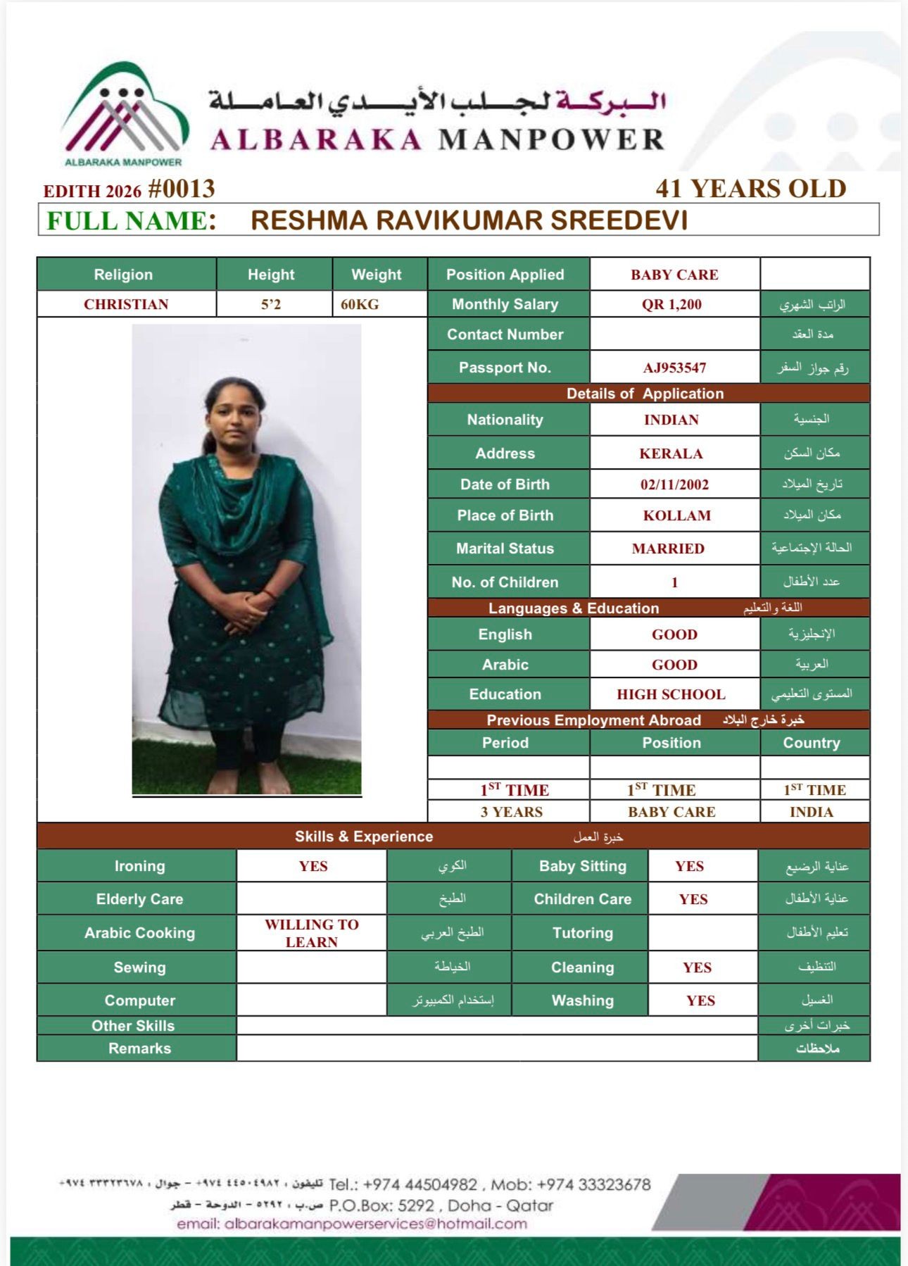 الاسم - عربي RESHMA RAVIKUMAR SREEDEVI