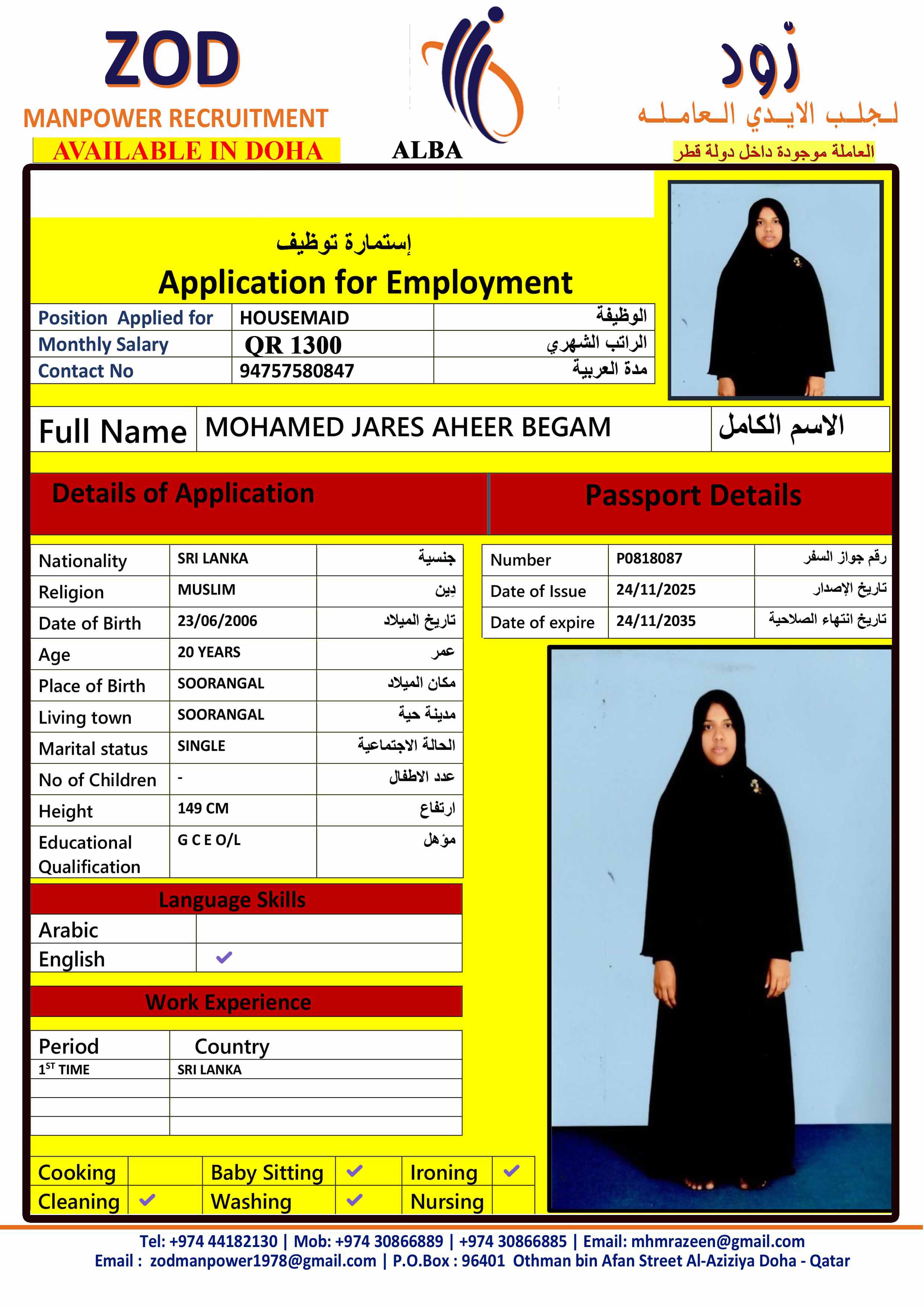 الاسم - عربي AHEER BEGAM JARES MOHAMED