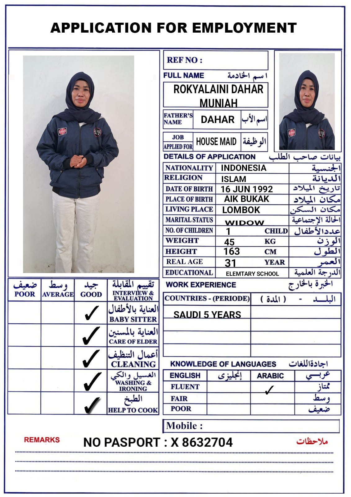 الاسم - عربي ROKYALAINI DAHAR MUNIAH