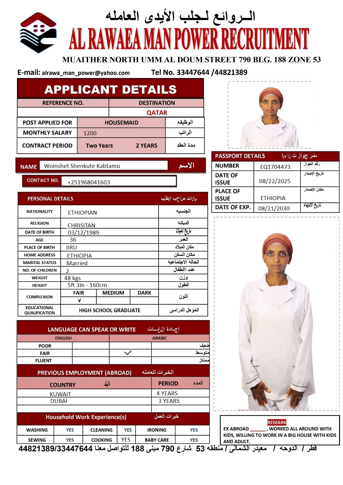 الاسم - عربي Woinshet Shenkute Kabtamuu