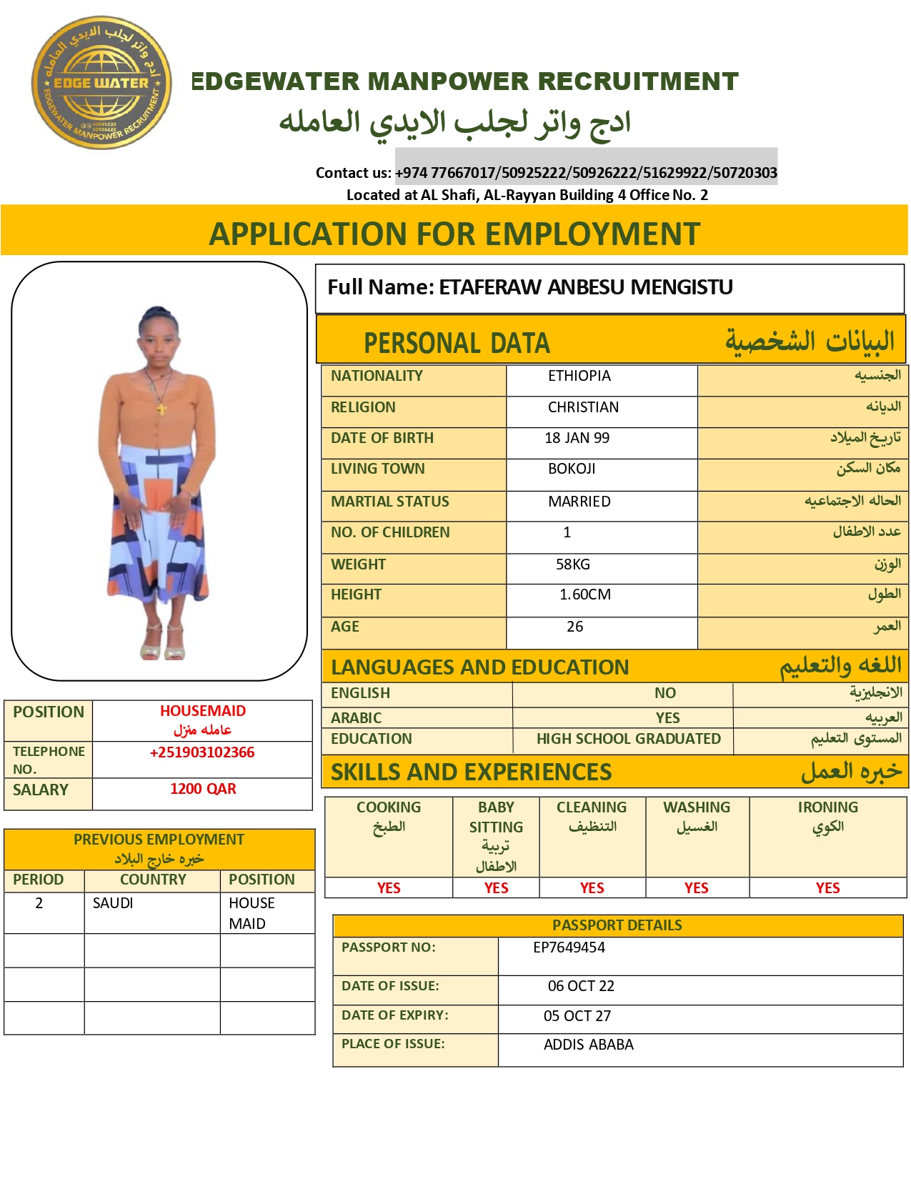 الاسم - عربي ETAFERAW ANBESU MENGISTU