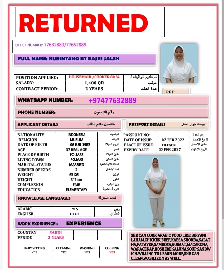 الاسم - عربي NURINTANG SALEH 80 PERCENT COOKER /INDONESIA