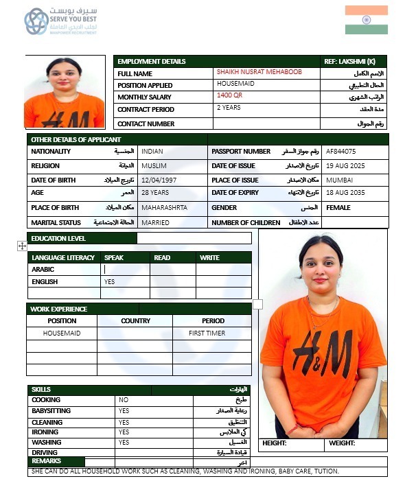 الاسم - عربي SHAIKH NUSRAT MEHABOOB