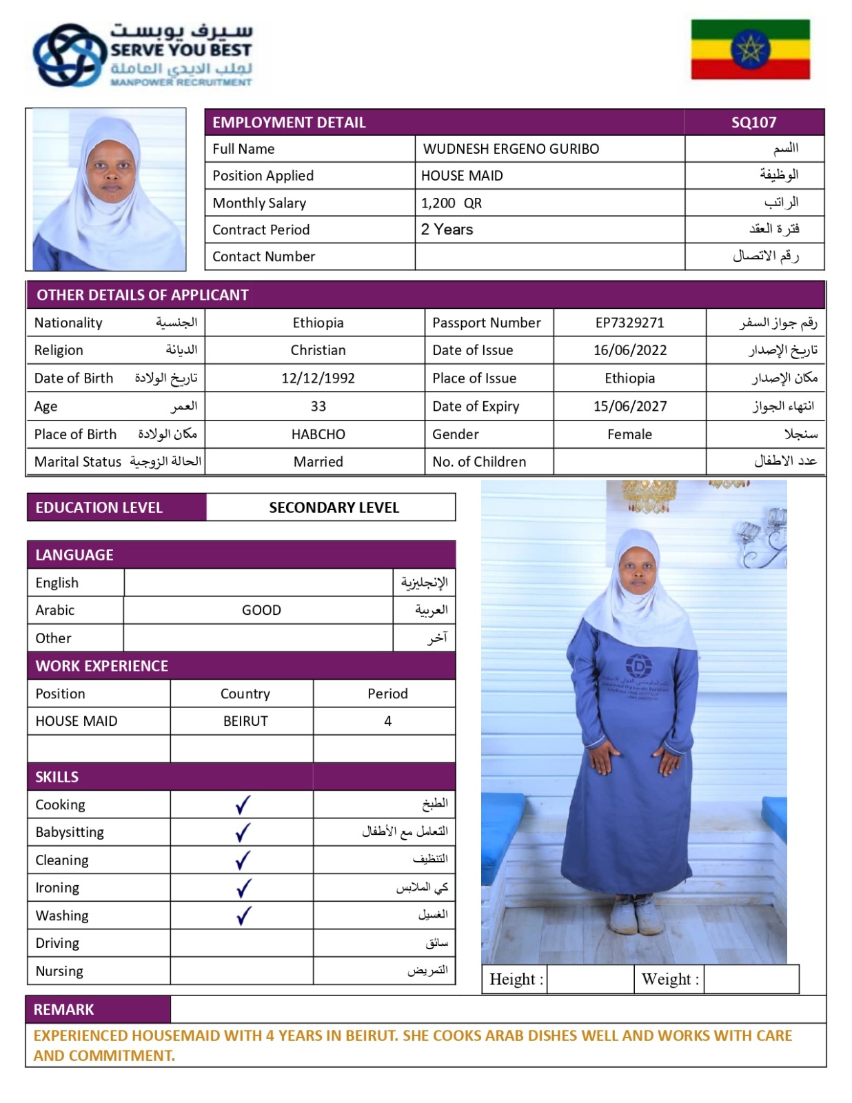 عاملة اثيوبية خبرة لبنان بيروت اربعة سنوات طبخ مع التنظيف ورعاية الاطفال