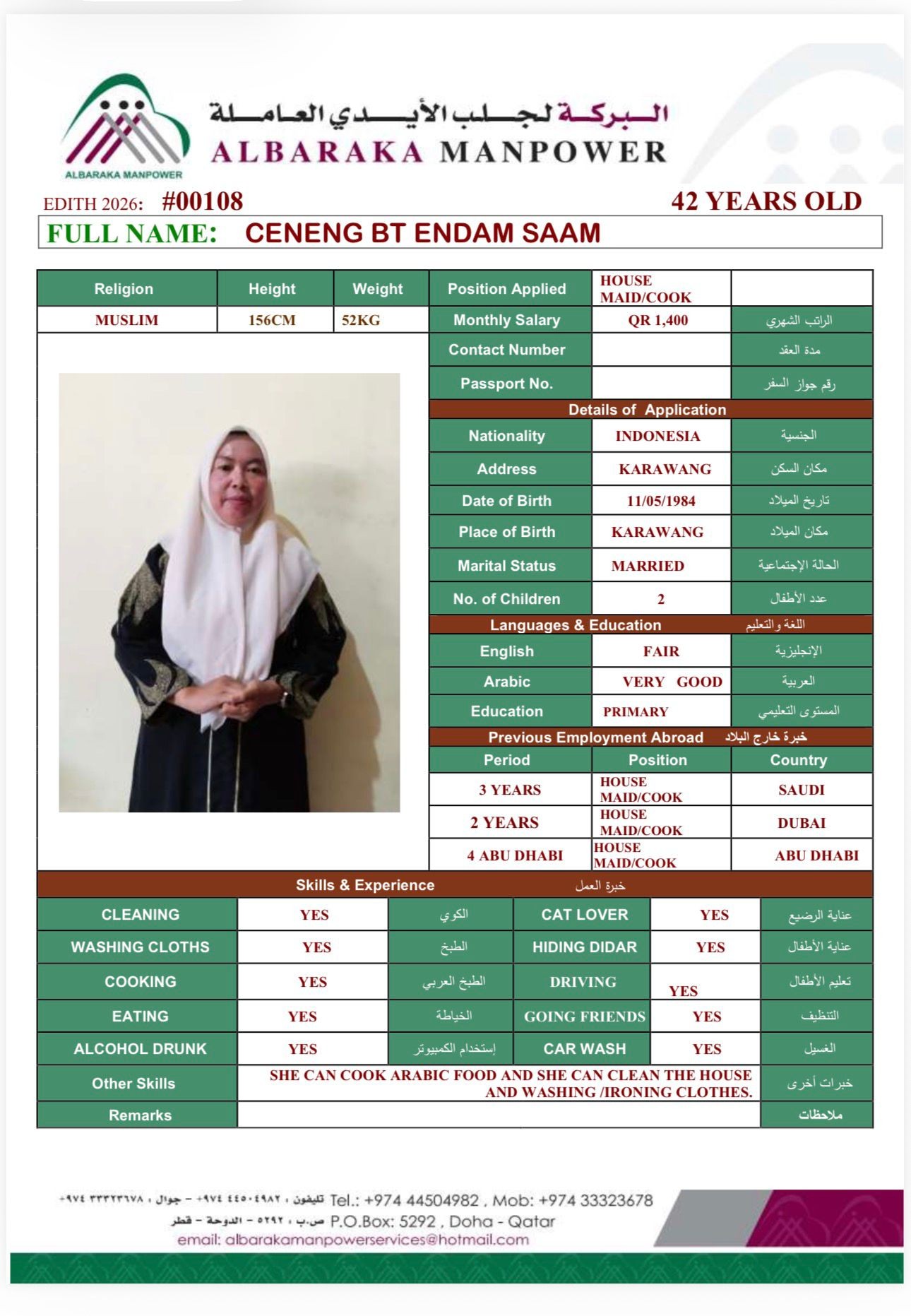 SHE CAN COOK ARABIC FOOD AND SHE CAN DO ALL HOUSE WORKS , SHE HAVE 9 YEARS EXPERIENCE IN GULF