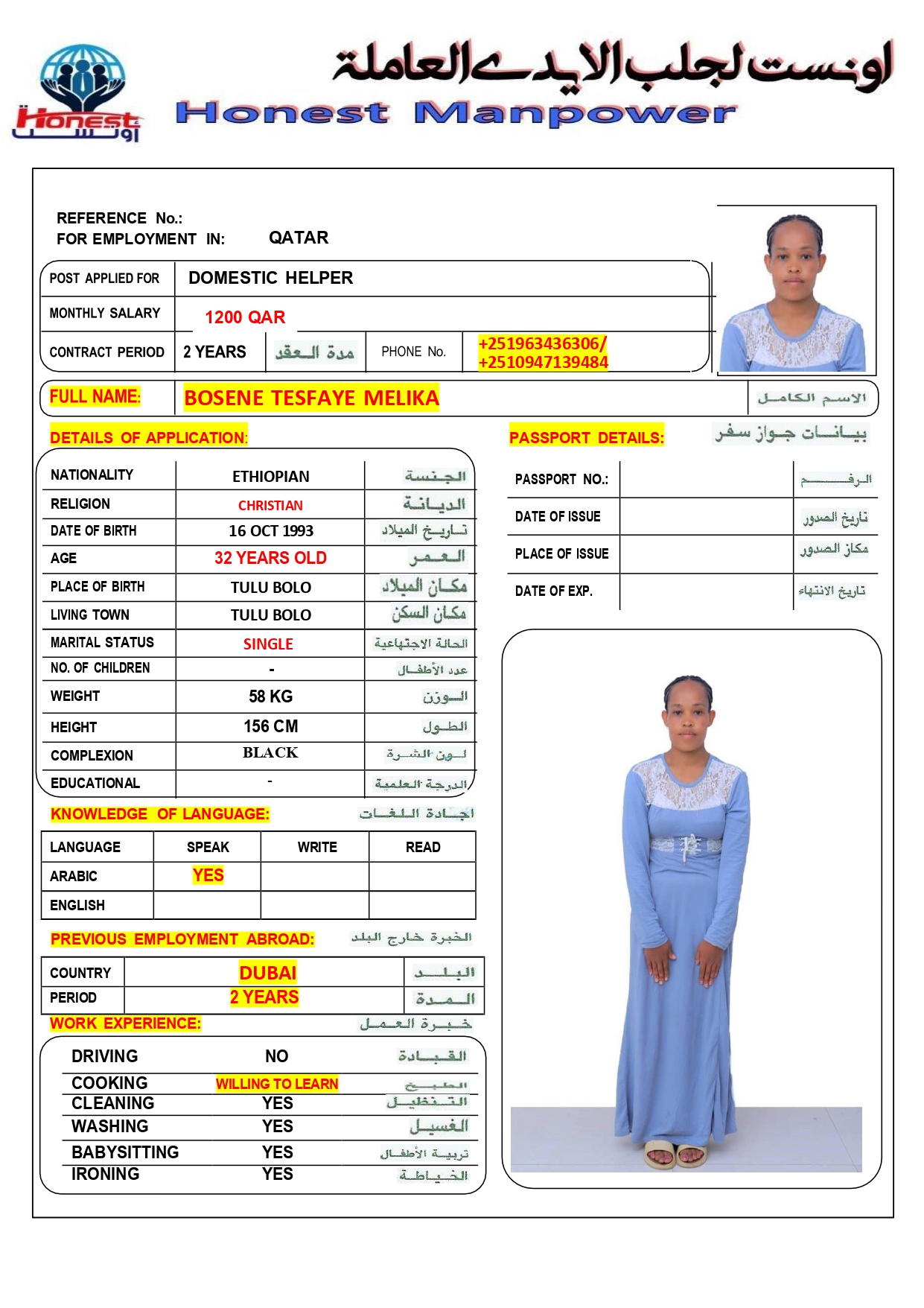 الاسم - عربي BOSENE TESFAYE MELIKA