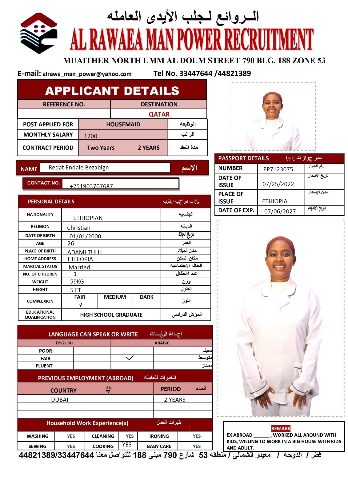الاسم - عربي Redat Endale Bezabignx