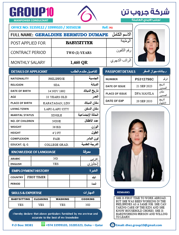 الاسم - عربي GERALDINE BERMUDO DUMAPE