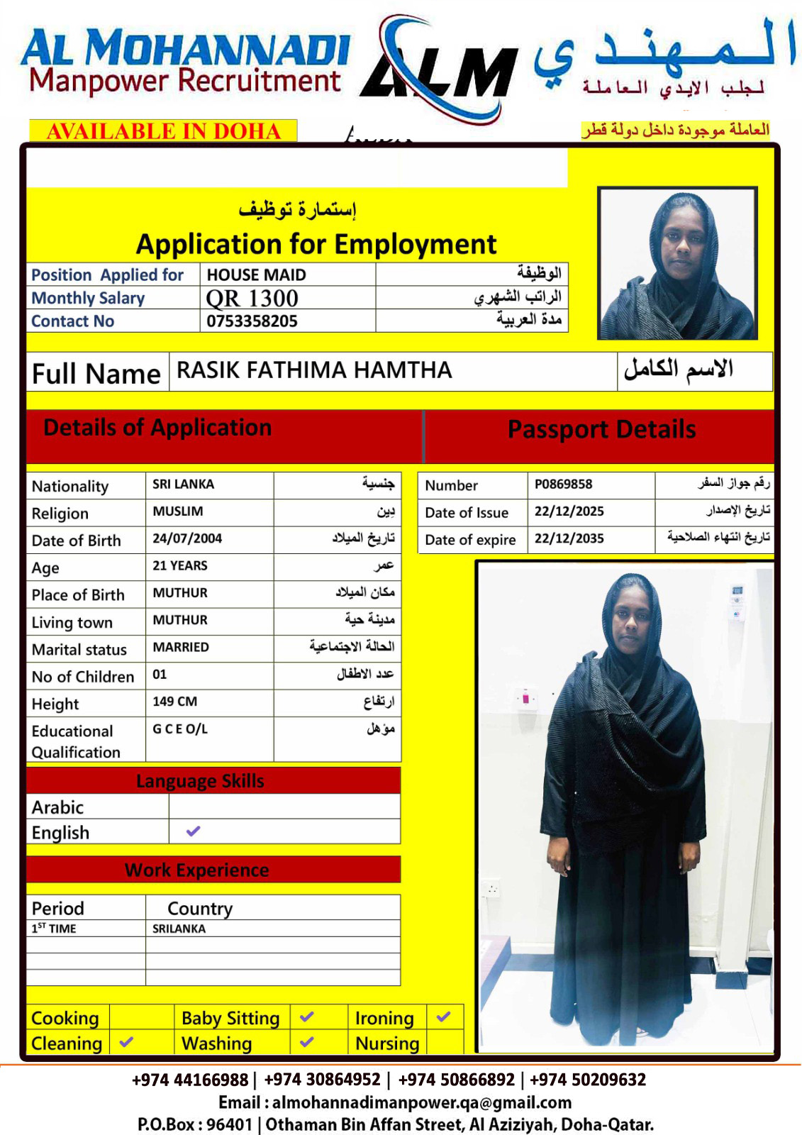 الاسم - عربي FATHIMA HAMTHA