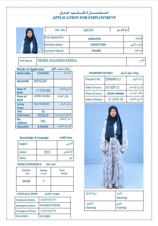 الاسم - عربي NISIBA SOLOMON FERISA