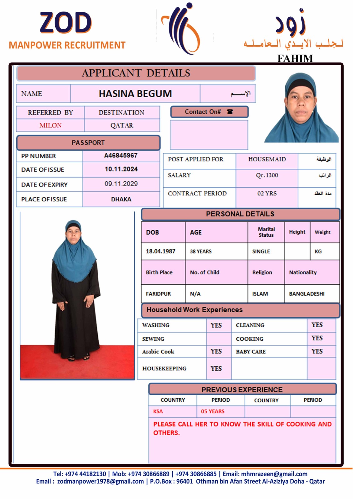 الاسم - عربي HASINA BEGUM