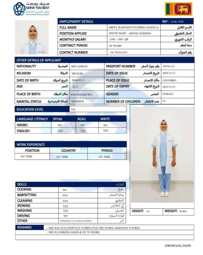 الاسم - عربي ABDUL RAHUMAN PATHIMA NASEELA
