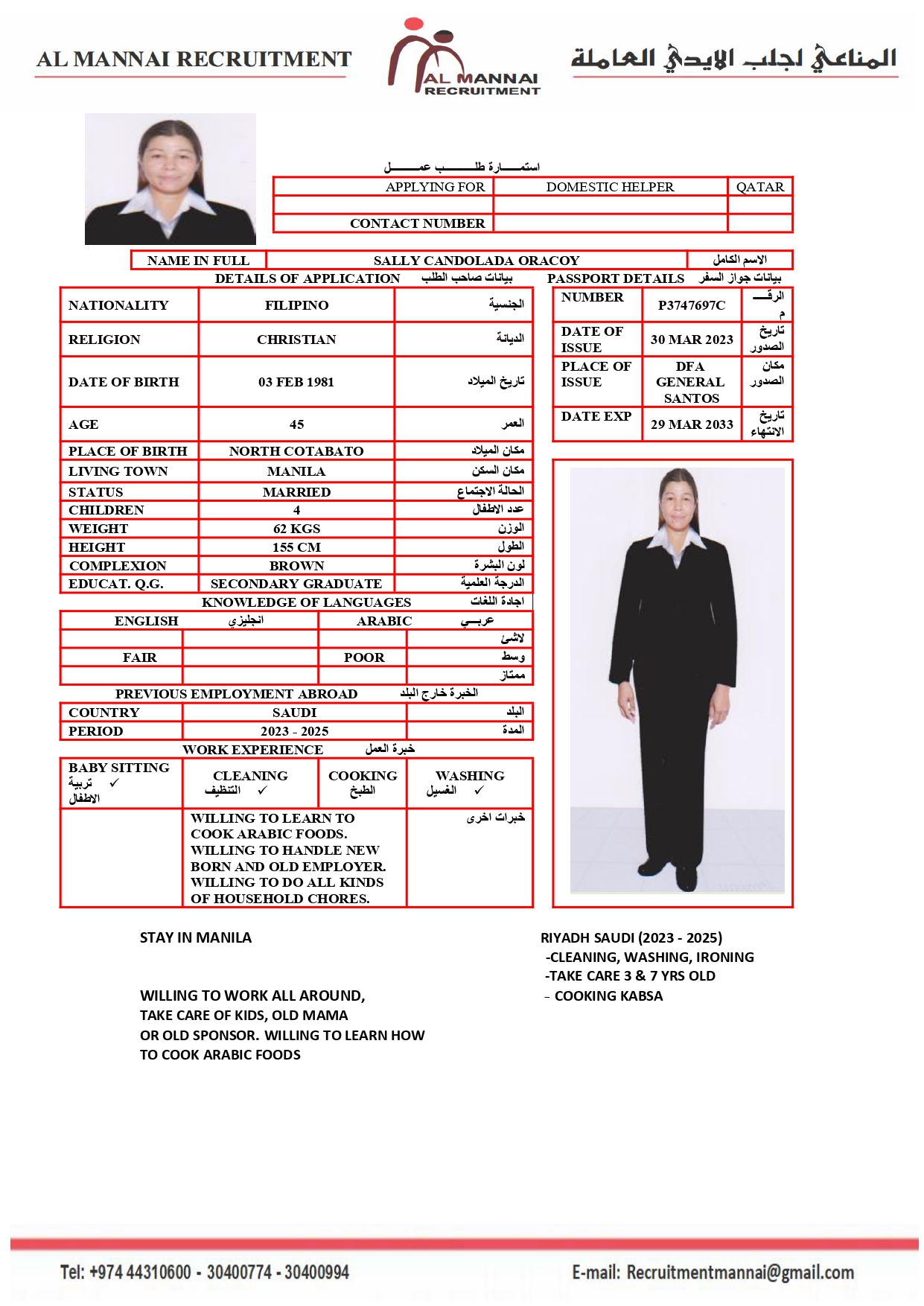 الاسم - عربي SALLY CANDOLADA ORACOY