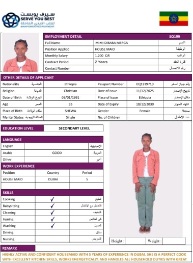 عاملة اثيوبية خبرة خمسة سنوات داخل دبي طبخ وتنظيف ورعاية اطفال