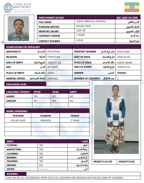 الاسم - عربي TSEHAY BIRHANU DEMASA