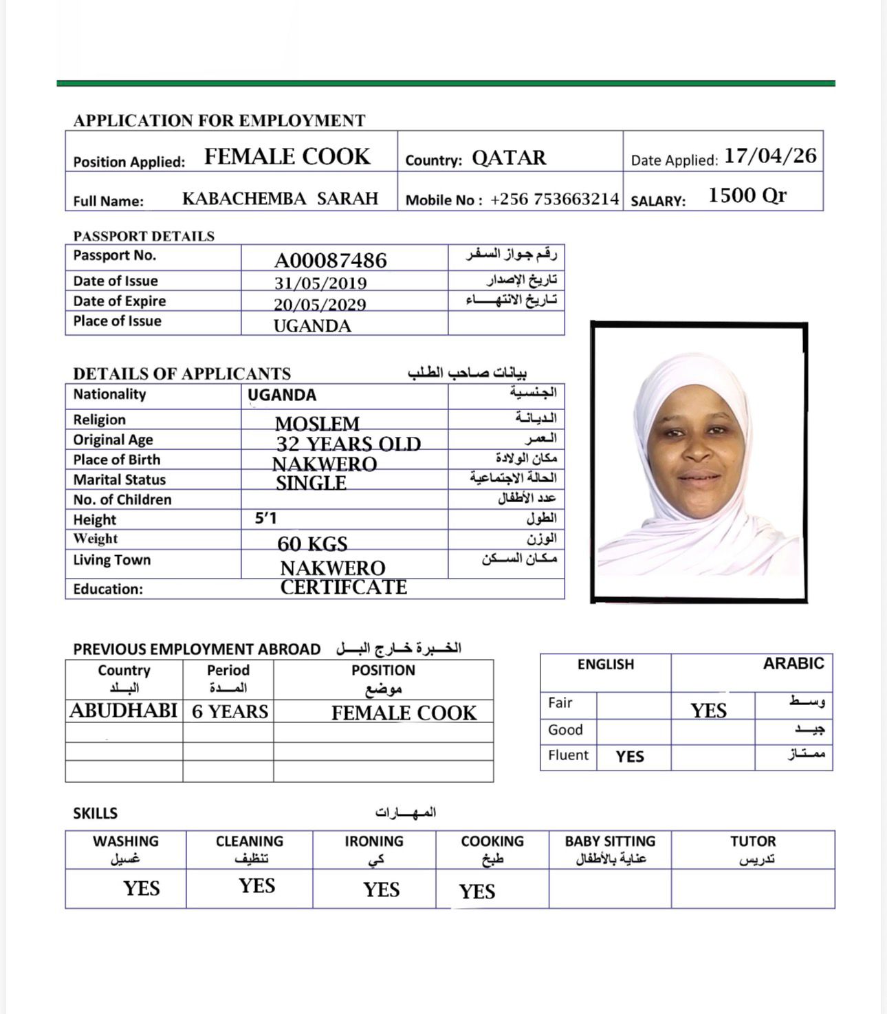 الاسم - عربي KABACHEMBA SARAH