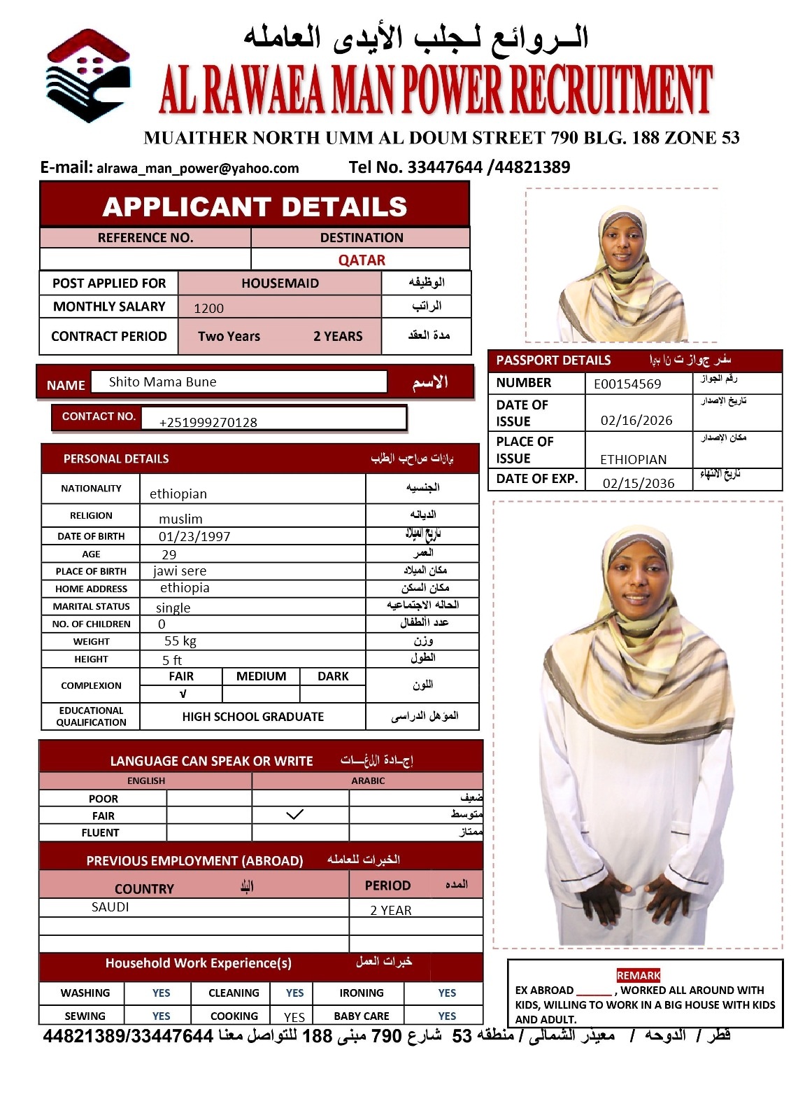 العنوان الدوحه / معيذر الشمالى / شارع ام الدوم منطقه 53 شارع 790 مبنى 188