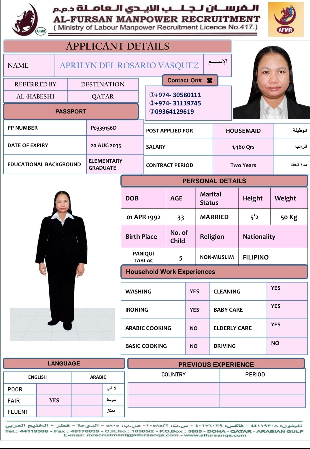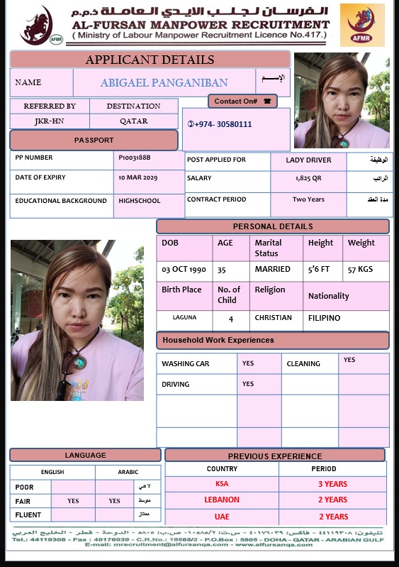 Dear customers Al Fursan Manpower office has 30 years of experience in bringing applicants We provide domestic workers with experience in the Gulf, Muslim and non-Muslim Cooks, nannies, clean, laundry and ironing, and child and elderly care Available from the following nationalities:- Philippines, arrival within 45 days, price 15 thousand India, arrival within a month, price 14 thousand Bangladesh, arrival within 45 days, price 13 thousand We also provide Indian drivers, Qatari and Gulf licenses To contact 77715901 (Arabic speaker)