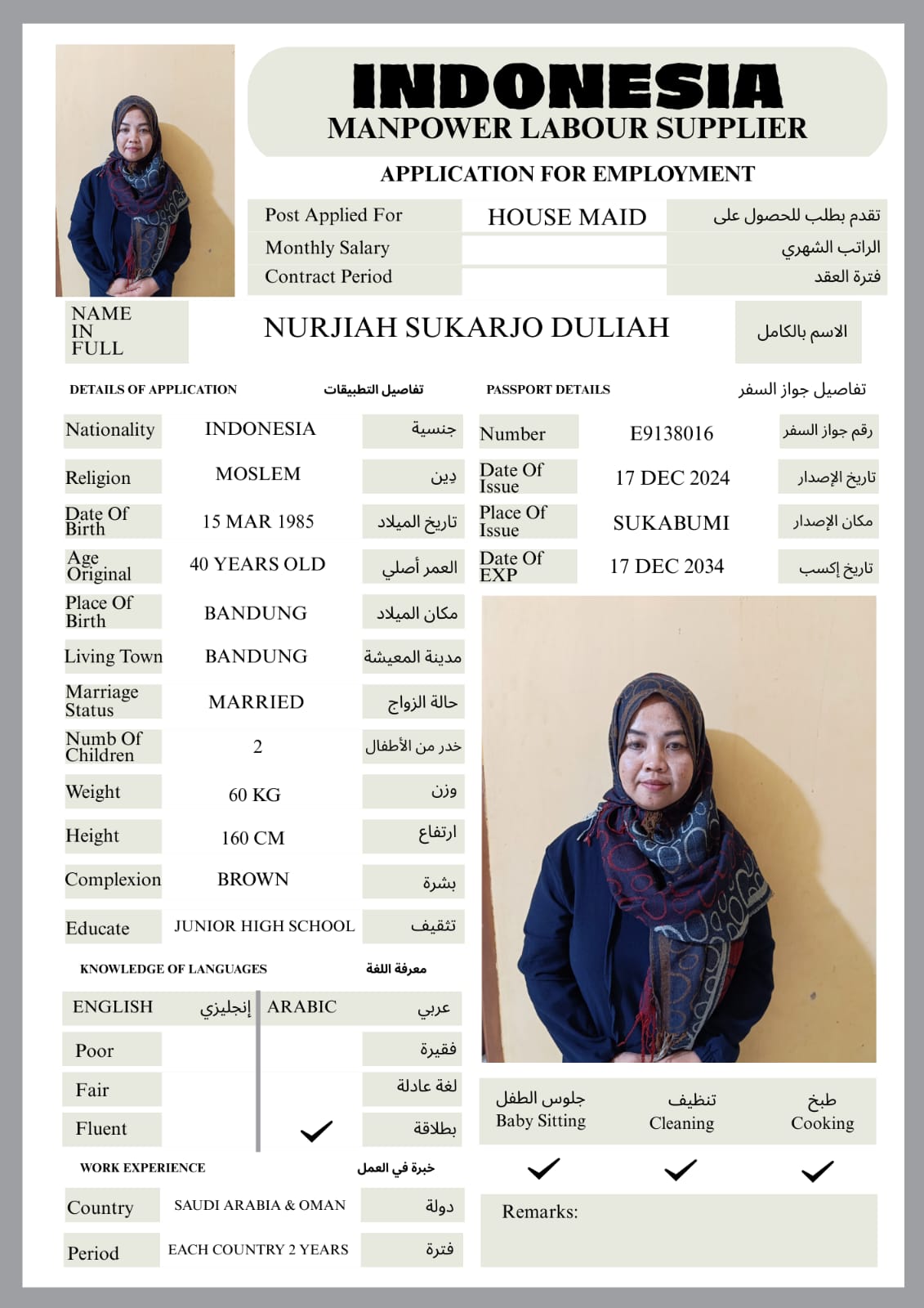 SHE CAN CLEANING, WASHING, IRONING, TAKE CARE OF BABY AND SHE CAN COOK ARABIC FOODS.