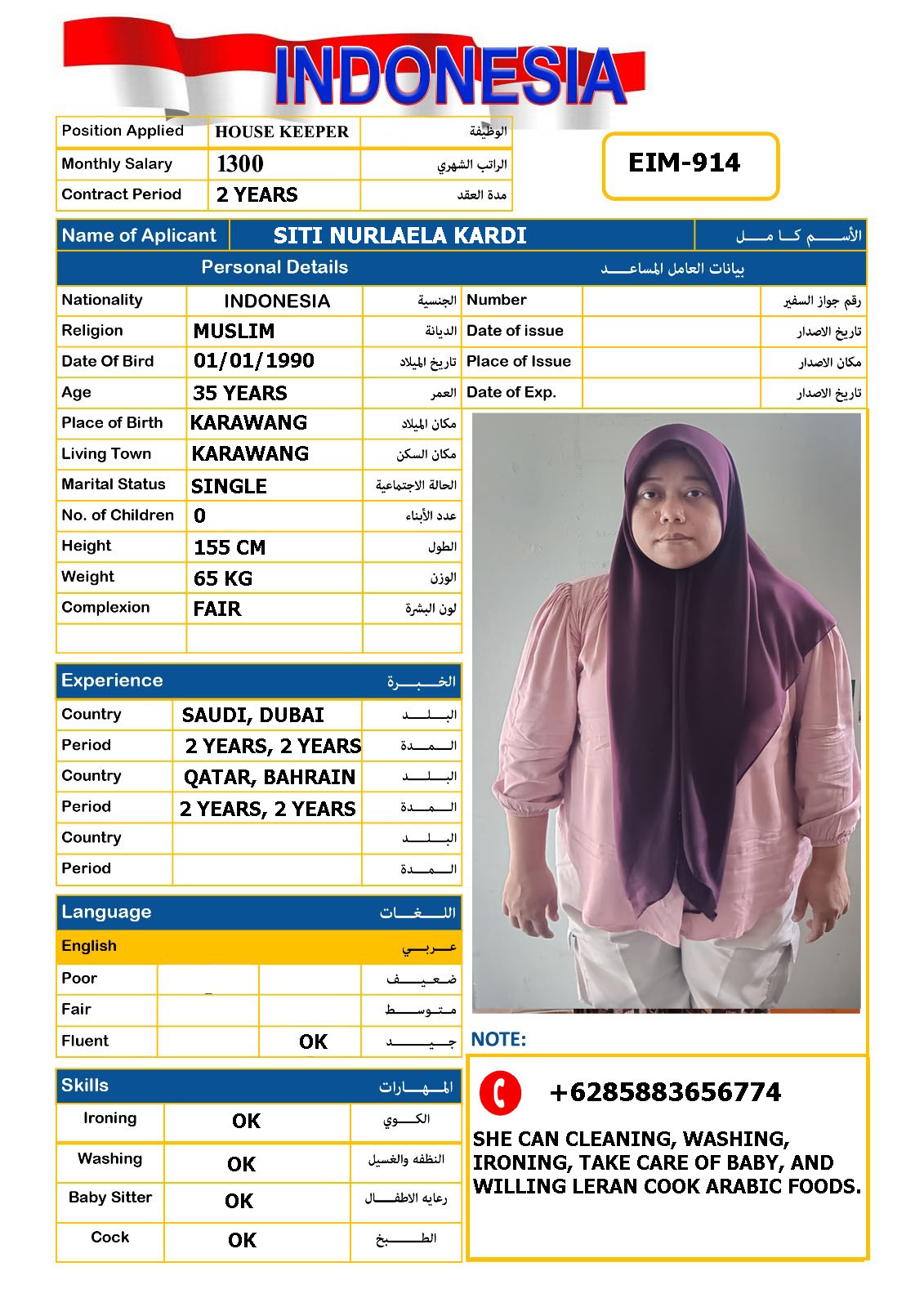 SHE CAN CLEANING, WASHING, IRONING, TAKE CARE OF BABY AND SHE CAN COOK ARABIC FOODS..
