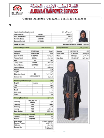 Welcome Are you looking for a driver, nurse, house manager, cleaner, nanny, secretary, professional workers for companies, security and guard personnel, foreman .... etc. Have you spent a long time looking for a maid? Have you made a great effort to find the right person? But to no avail ... Don't worry, we have the perfect solution to your problem Services…