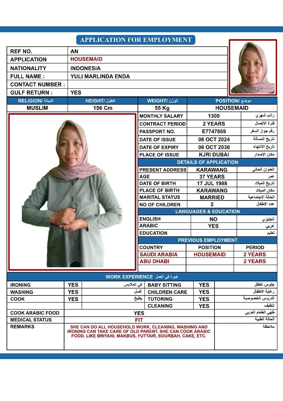 SHE CAN CLEANING, WASHING, IRONING, TAKE CARE OF BABY, AND SHE CAN COOK ARABIC FOODS.