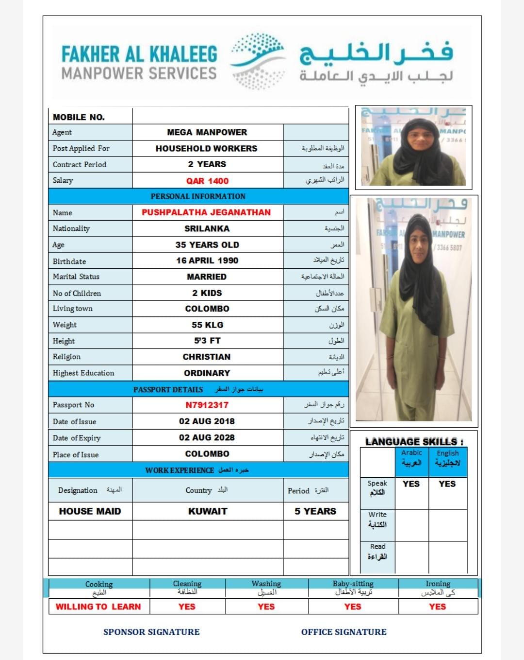 Welcome Are you looking for a driver, nurse, house manager, cleaner, nanny, secretary, professional workers for companies, security and guard personnel, foreman .... etc. Have you spent a long time looking for a maid? Have you made a great effort to find the right person? But to no avail ... Don't worry, we have the perfect solution to your problem Services…
