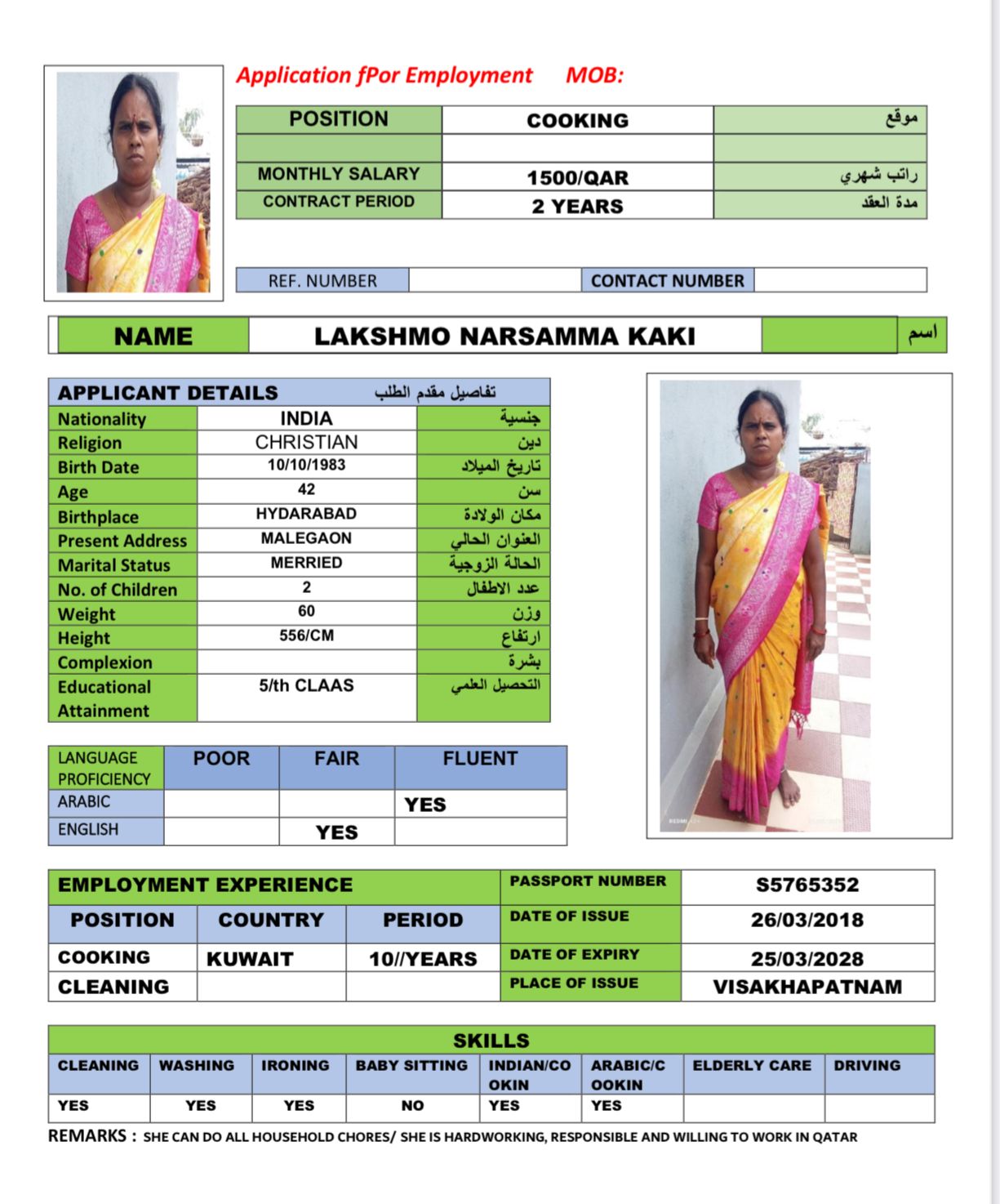 | SHE HAVE 10 YEARS COOKING EXPERIENCE IN KUWAIT | |