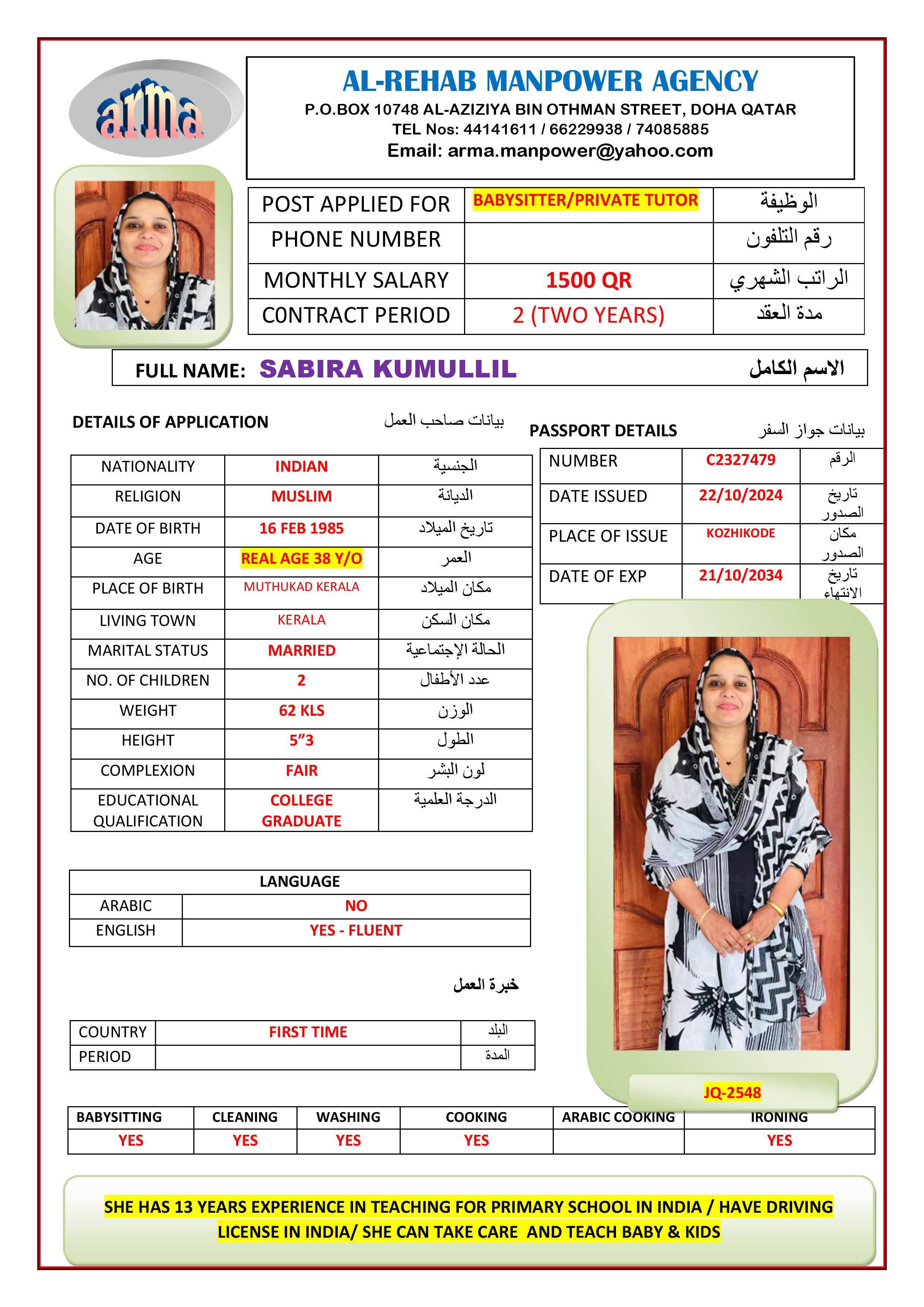 SHE HAS 13 YEARS EXPERIENCE IN TEACHING FOR PRIMARY SCHOOL IN INDIA / SHE KNOWS TO DRIVE WITH INDIAN DRIVERS LICENSE