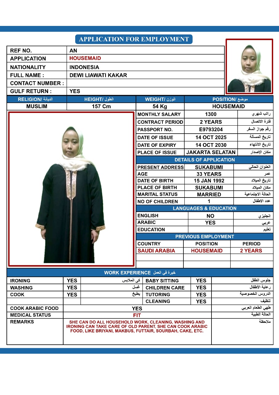 SHE CAN CLEANING, WASHING, IRONING, TAKE CARE OF BABY AND SHE CAN COOK ARABIC FOODS,