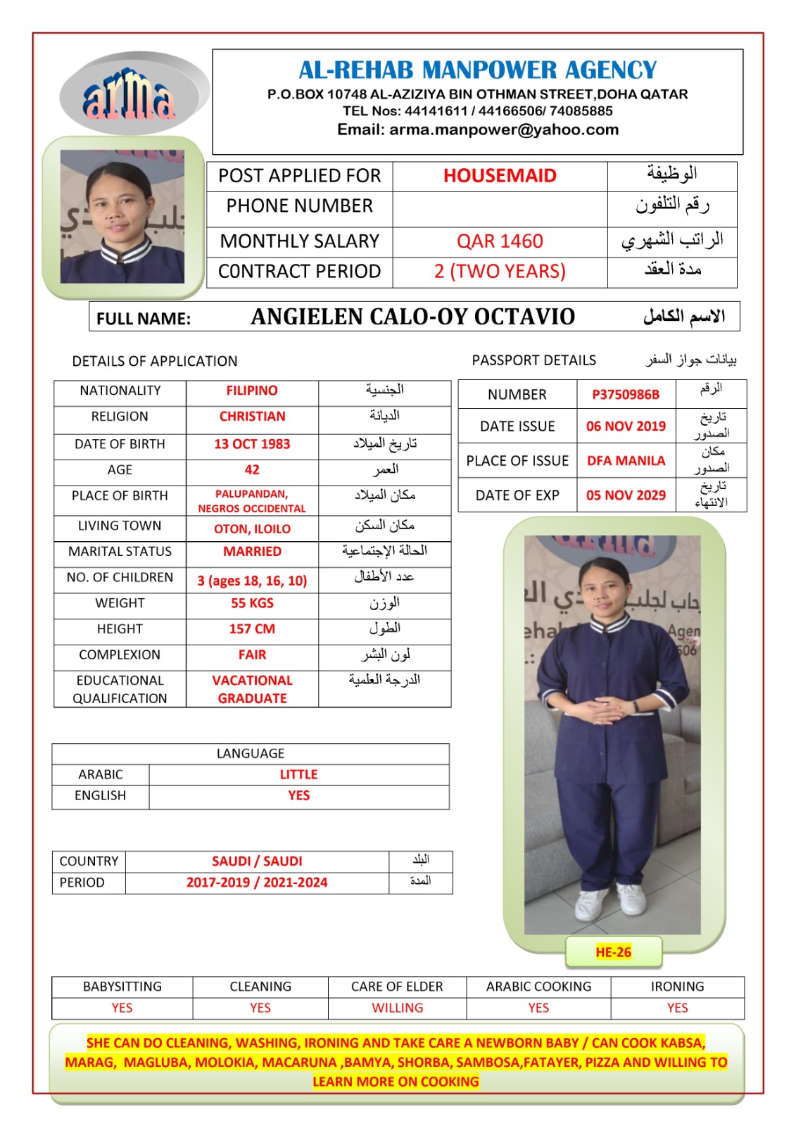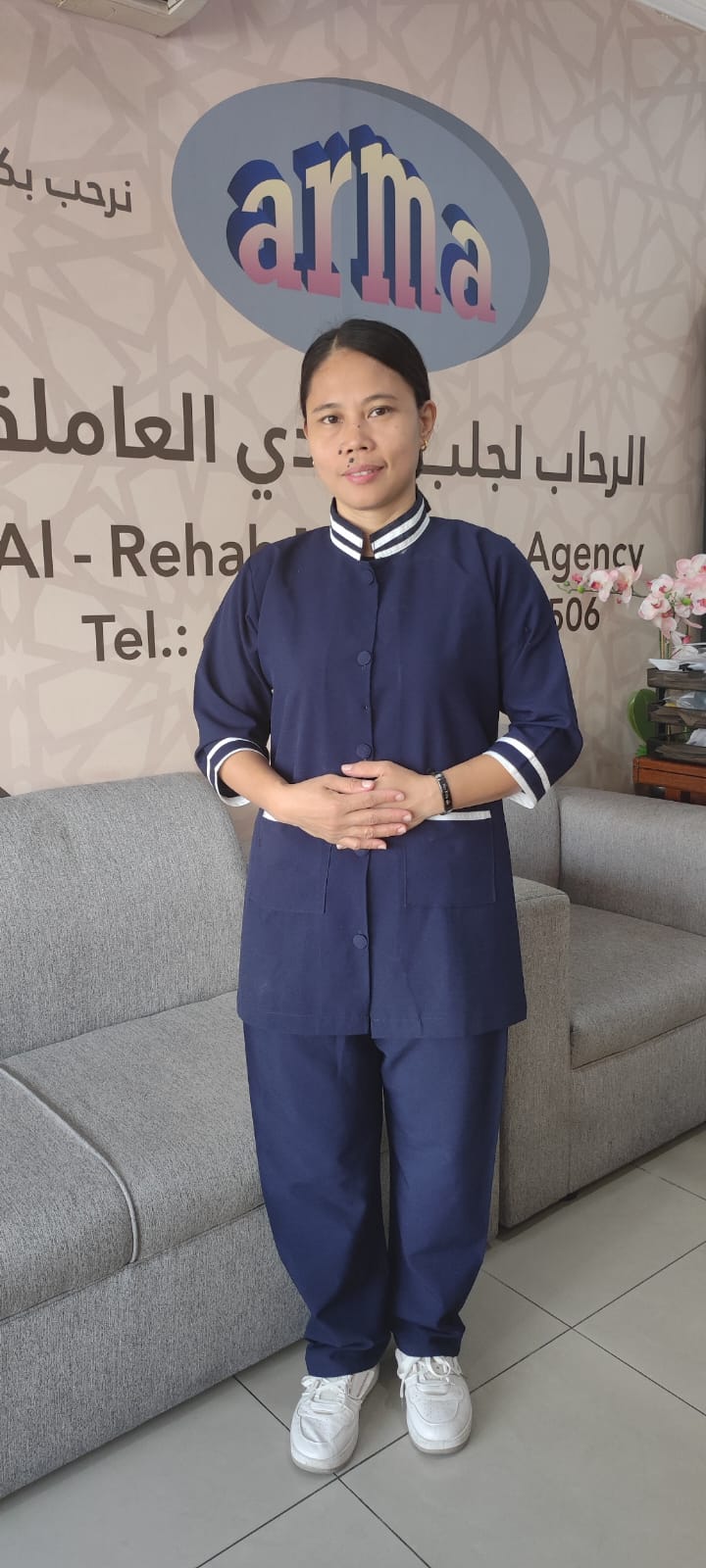 SHE CAN DO ALL HOUSEHOLD CHORES, SHE CAN TAKE CARE NEW BORN BABY AND KIDS, SHE CAN COOK KABSA, MARAG, MAGLUBA, MOLOKIA, MACARUNA, BAMYA, SHORBA, SAMBOSA, FATAYER, PIZZA AND WILLING TO LEARN MORE ON COOKING.